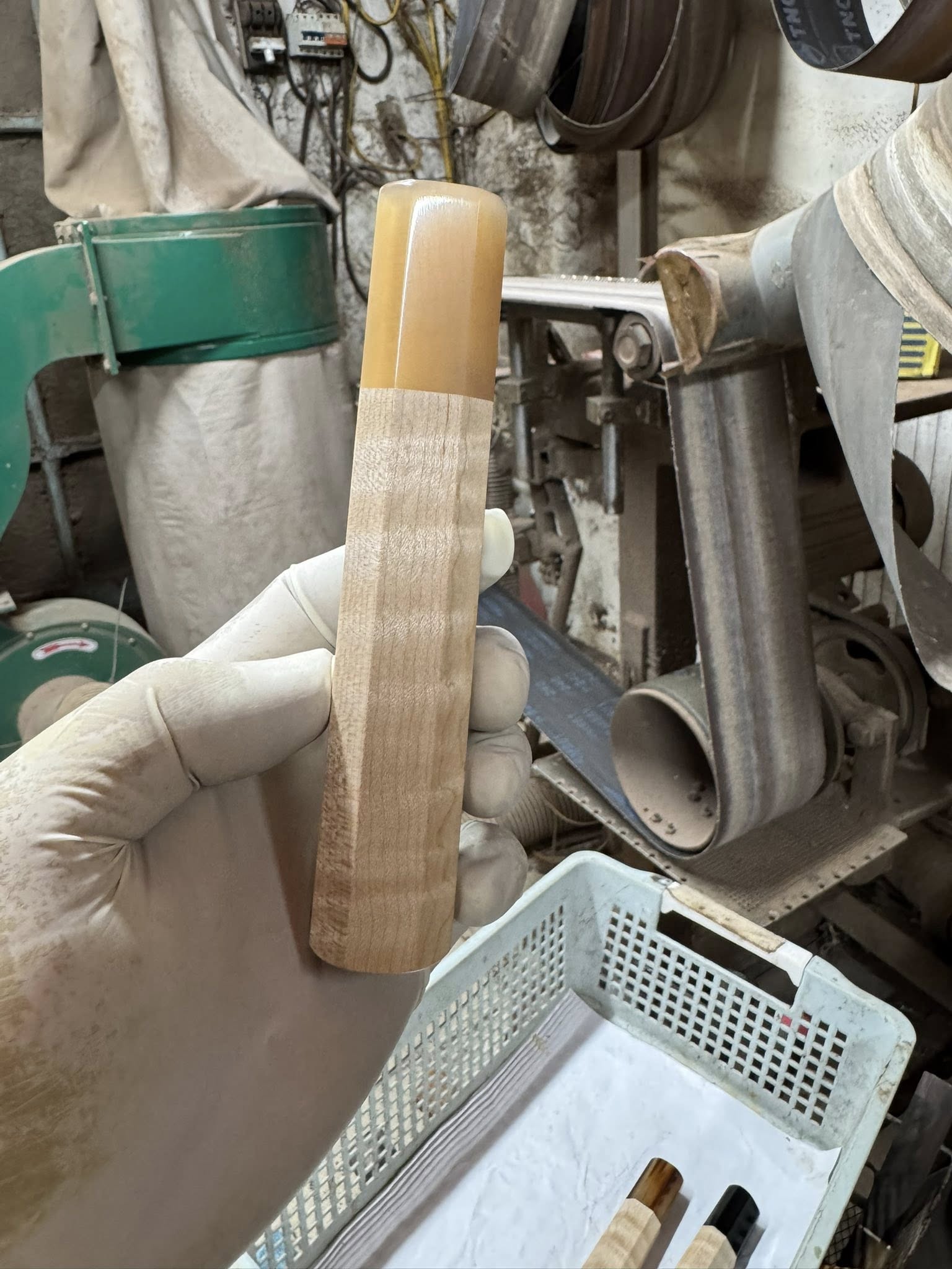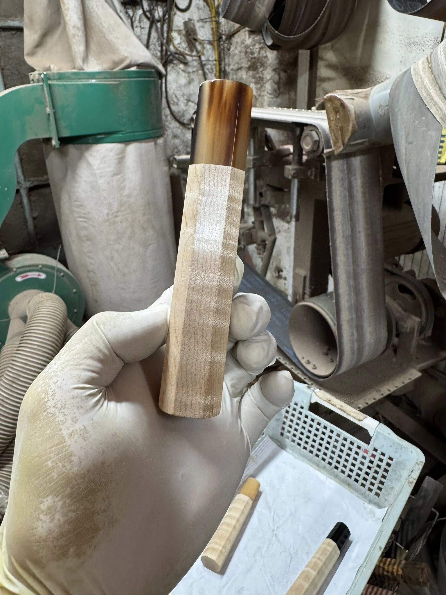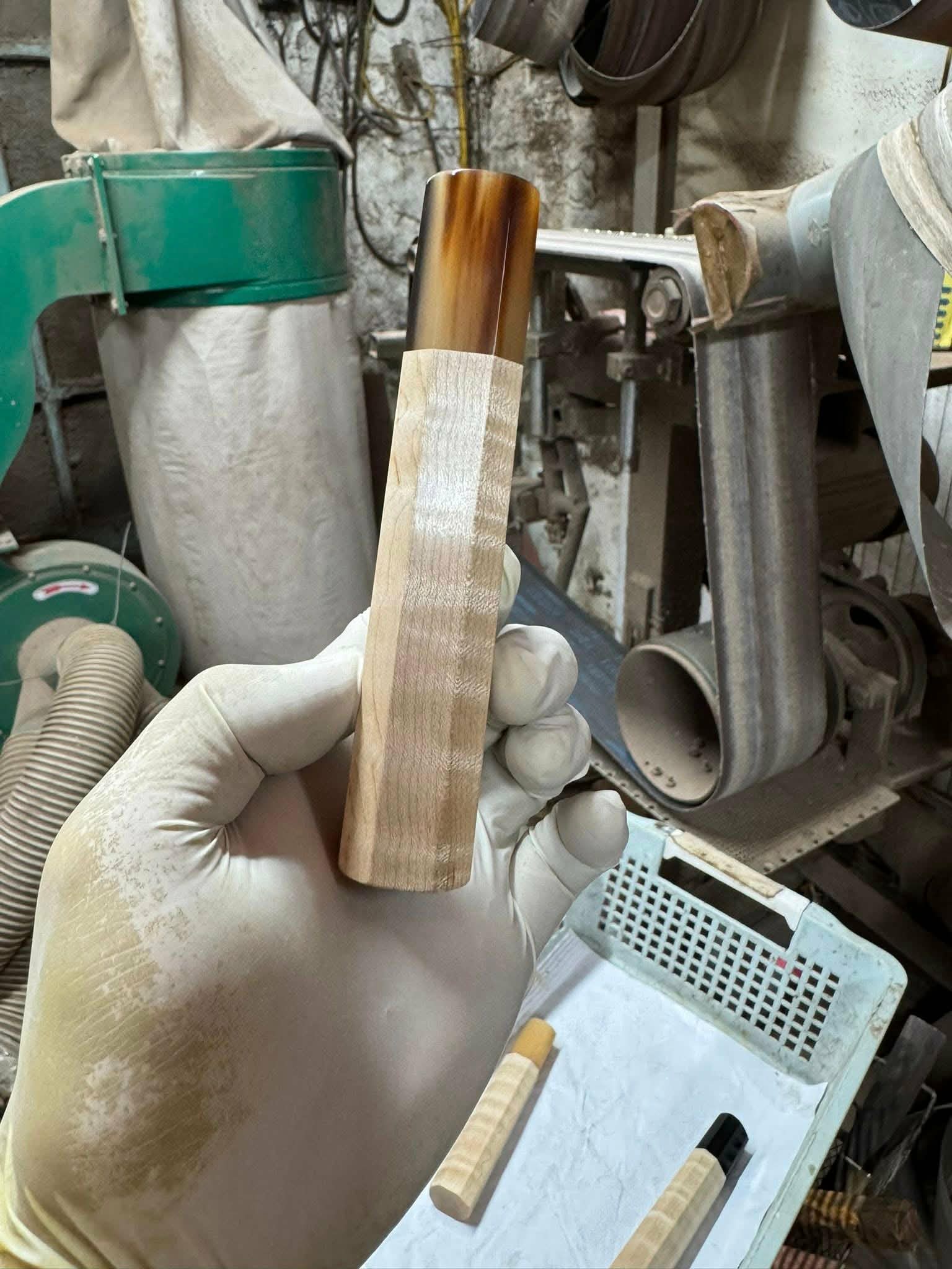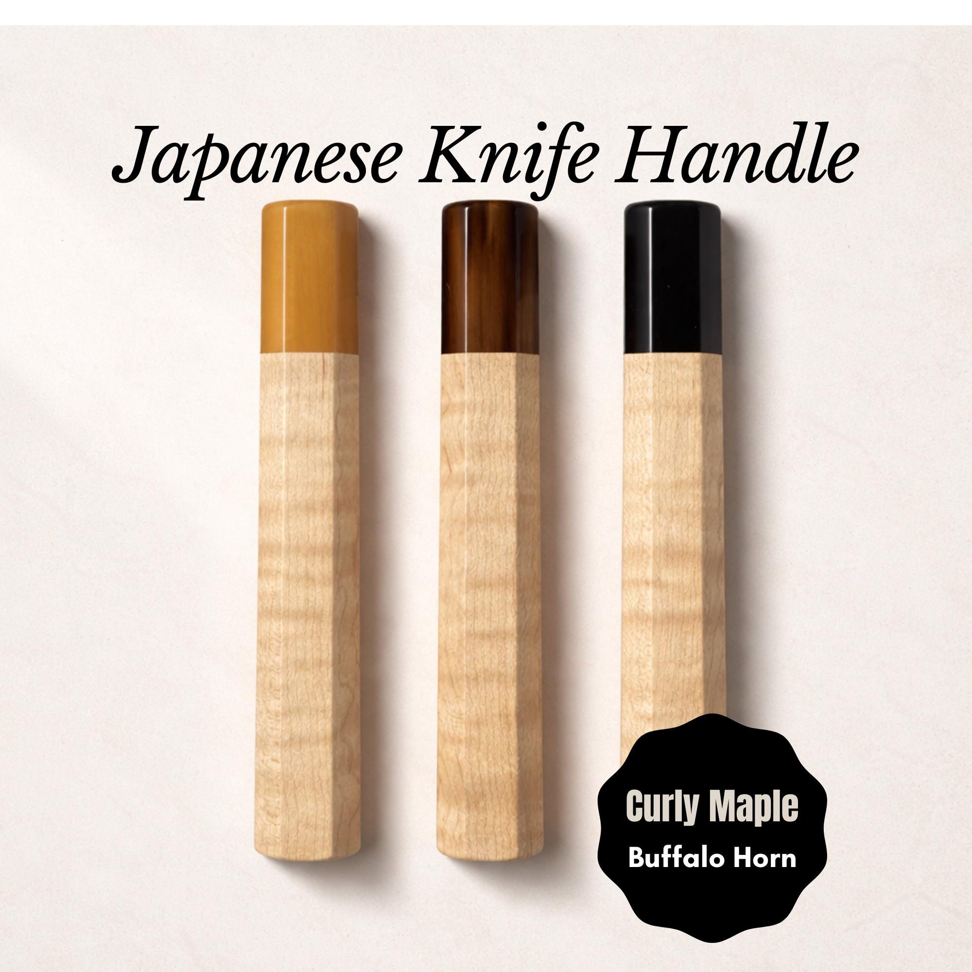 Maple is lighter than the dense tropical hardwoods, giving this handle a quicker, more neutral balance ideal for fast-moving work — petty knives, smaller gyutos, honesuki. The pale, warm tone takes on a subtle amber patina over years, and the curl deepens with the oils it collects from use.